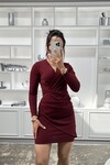 3037-BORDO KISA DRAPELİ KRUVAZE YAKA ELBİSE