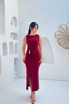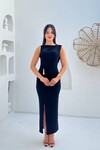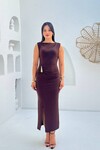 3846-KAHVERENGİ SIFIR KOL OMUZ DRAPLEİ TOKALI ELBİSE