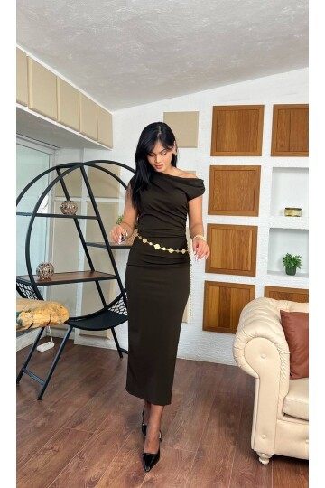 3851-KAHVERENGİ TEK OMUZ ZİNCİR KEMERLİ ELBİSE