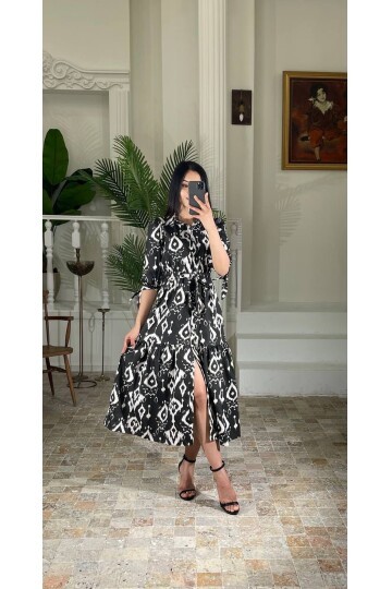 3026-SİYAH GÖMLEK YAKA KOL BÜZGÜ KISA KOL ELBİSE