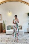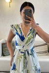 3073-MAVİ YAPRAK DESEN KEMERLİ ELBİSE