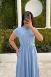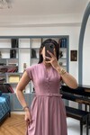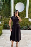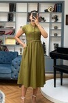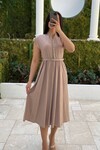 3440-BEJ GOLD KEMER DETAY VE GOLD DÜĞMELİ ELBİSE