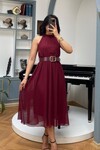 3734-BORDO SIFIR KOL KEMERLİ ELBİSE