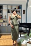3746-HAKİ OMUZLARI TOKA DETAY ELBİSE