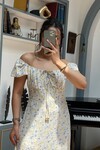 3777-SARI ÇİÇEK DESEN BONCUKLU ELBİSE
