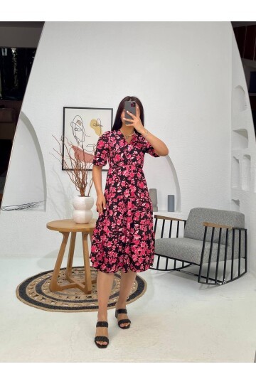 3058-PEMBE ÇİÇEKLİ ELBİSE