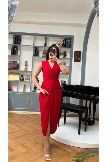 3698-KIRMIZI ÖNÜ BÜZGÜLÜ ELBİSE