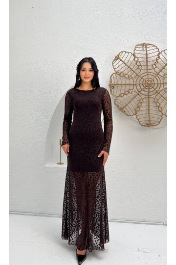 3874-KAHVERENGİ LEOPAR DESEN FLOK BASKI ELBİSE