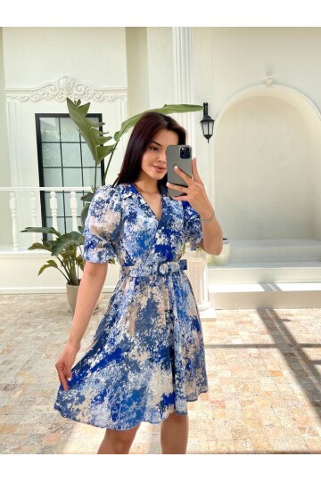 3414-MAVİ VİSKON KUMAŞ KISA KOL GÖMLEK ELBİSE